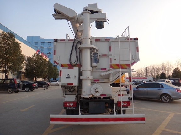 液壓式散裝飼料運輸車的飼料罐架設在卡車的底盤上,專用設施由罐體總成、輸送系統(tǒng)(水平卸料系統(tǒng)、垂直卸料系統(tǒng)以及活動卸料系統(tǒng)組成)、液壓系統(tǒng)(高壓油泵經(jīng)管路與分配閥連接該閥的三個輸出端分別是轉(zhuǎn)角液壓馬達、升降油缸以及串聯(lián)在一起的水平卸料、垂直卸料、活動卸料液壓馬達)、電動系統(tǒng)、氣動分倉機構(gòu)等組成。在罐體底部設有閘門,在閘門下面裝有水平螺旋輸送器(俗稱水平攪籠),由取力器由汽車變速箱輸出動力驅(qū)動,再傳動高壓油泵以驅(qū)動液壓系統(tǒng),液壓馬達通過傳動裝置帶動水平螺旋輸送器的葉片軸及葉片旋轉(zhuǎn), 經(jīng)活動輸送系統(tǒng)(俗稱活動攪籠)以將飼料輸出。車頂平置的一根活動卸料絞龍可自由回轉(zhuǎn)和抬升,運輸時,頂部的螺旋管平臥在罐頂;卸料時則抬起,使管端的出料口與畜禽飼養(yǎng)場貯料罐頂部的進料門相接、對準,完成卸料。