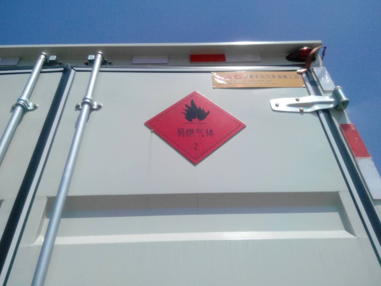 | 運(yùn)輸介質(zhì)為易燃?xì)怏w氣瓶,類項(xiàng)號(hào)為2.1;選裝帶液壓尾板,選裝不帶側(cè)門,側(cè)后防護(hù)材料為Q235A,螺栓連接,后防護(hù)截面尺寸(高×寬)為100mm×50mm,離地高度為424mm;選用危險(xiǎn)品運(yùn)輸車專用底盤,僅選用底盤子午線輪胎,ABS系統(tǒng)控制器型號(hào):CM4YL,ABS系統(tǒng)控制器生產(chǎn)企業(yè):廣州市科密汽車制動(dòng)技術(shù)開發(fā)有限公司,前輪安裝盤式制動(dòng)器,安裝限速裝置,限速80km/h,排氣管前置,安裝具有衛(wèi)星定位功能的行駛記錄儀.僅選用底盤發(fā)動(dòng)機(jī)HFC4DA1-2C和YC4FA115-40,對(duì)應(yīng)油耗值(L/100km)為12.7和12.5 | |||