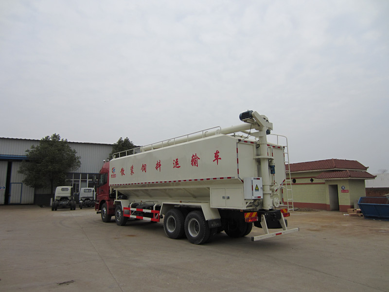 散裝飼料車工作原理:袋料,散裝飼料車在工作的時候首先打開箱體頂部中間兩倉的接料口,裝滿第一種飼料并保證每倉裝載3T然后打開最前及最后兩倉接料口,裝第二種飼料。這兩個倉位常閉倉,設(shè)有單獨倉口,因此也可分別裝載兩種飼料,這樣就實現(xiàn)整車裝運三種不同飼料的功能。