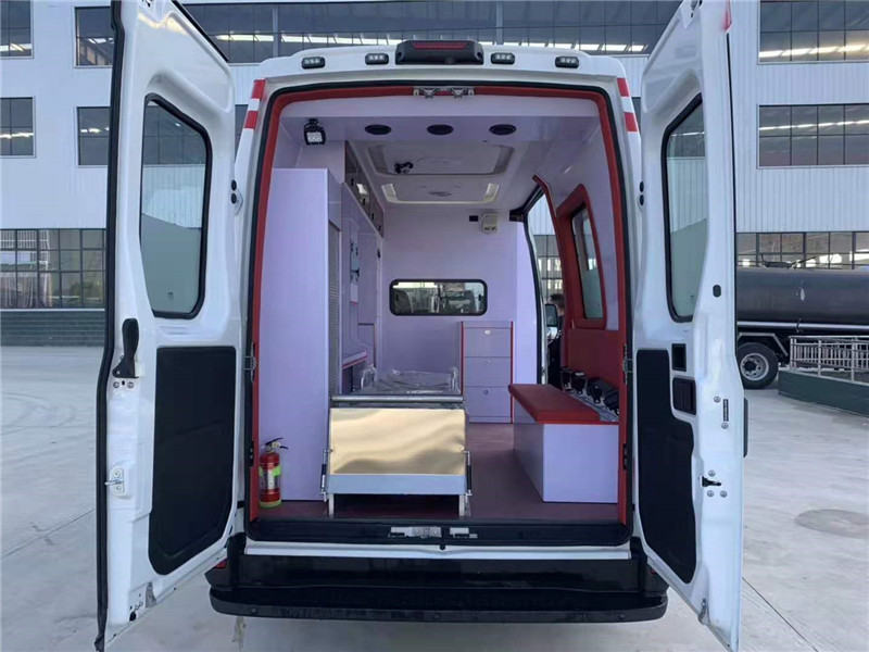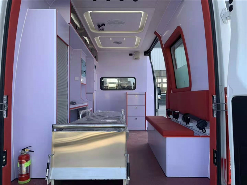 車底、側(cè)壁等加強(qiáng)預(yù)埋件1,全車隔熱、隔音材料1,車內(nèi)地板采用進(jìn)口耐酸、堿、防火、防滑、防靜電地板1,駕駛室與醫(yī)療艙安裝異型分隔墻(含一體式鋼化玻璃推拉窗)1,前后對(duì)講機(jī)1,車頂排風(fēng)扇1,醫(yī)療艙隔墻后折疊醫(yī)生看護(hù)座椅1,表面覆紅色或藍(lán)色皮革1,醫(yī)療艙左側(cè)藥品、器械儲(chǔ)物柜1,醫(yī)療艙左側(cè)吊柜1,隔墻后急救箱儲(chǔ)存柜(根據(jù)艙內(nèi)長(zhǎng)度選擇)1,醫(yī)療艙左側(cè)卷簾門儲(chǔ)物柜1,左側(cè)安裝10L鋁制氧氣瓶及方便拆卸固定架2,氧氣流量及壓力閥2,氧氣終端2,終端濕化瓶1,醫(yī)療艙內(nèi)右側(cè)安裝有安全帶的三人PVC材料柜式床,座墊及靠背表面用皮革包覆1,醫(yī)療艙內(nèi)頂部滑動(dòng)輸液瓶架1,頂部黃色安全扶手1,醫(yī)療艙安裝(國(guó)產(chǎn))自動(dòng)上車擔(dān)架1,上車擔(dān)架不銹鋼板導(dǎo)板1,后門左內(nèi)側(cè)安裝鏟式擔(dān)架(或在柜式床內(nèi)存放)1,不銹鋼污物桶1,醫(yī)療艙中門、尾門防撞頭靠1,滅火器,醫(yī)療艙左側(cè)黑色玻璃膜1,右側(cè)2/3磨砂膜1,車身腰部紅色/藍(lán)色強(qiáng)效反光帶。