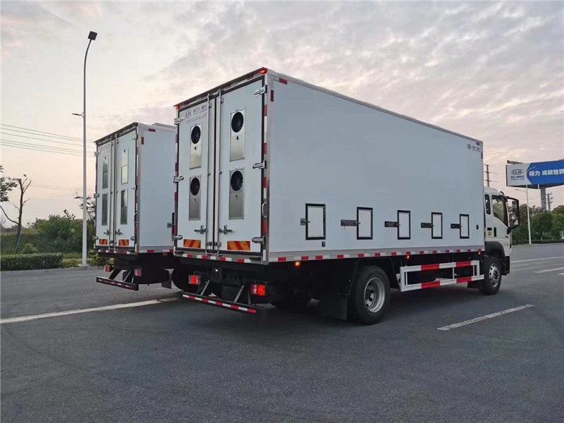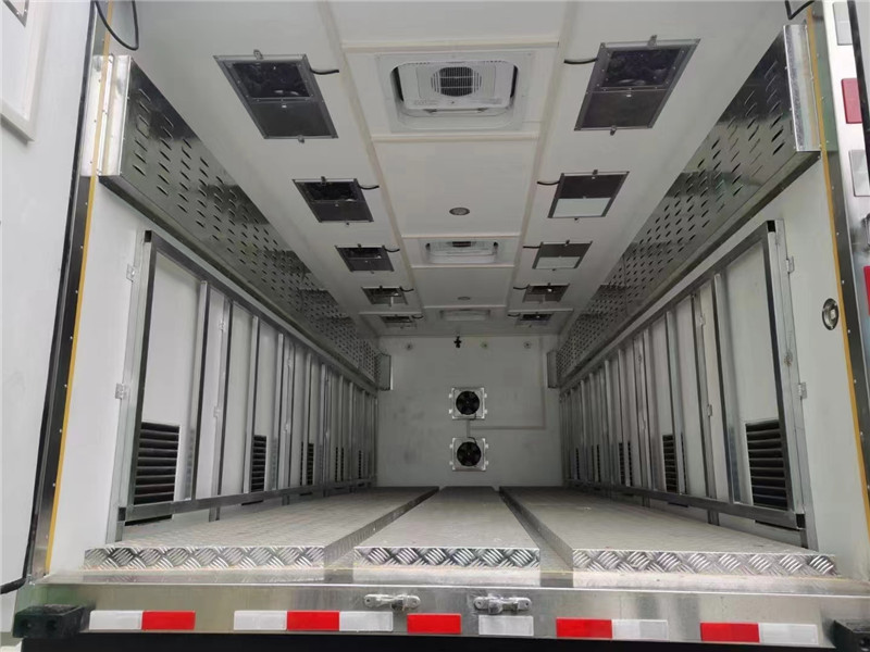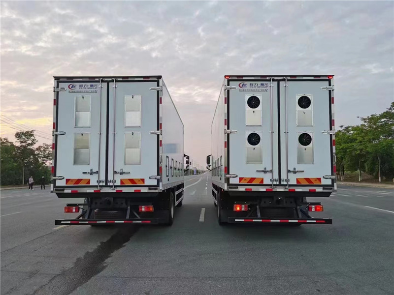 雞苗廂體兩側(cè)外部可開啟通風窗口各5個;頂部開開啟排氣天窗3個,天窗兩側(cè)各開5個排氣扇,尾門排氣扇4個,廂體內(nèi)側(cè)上部左右兩側(cè)配有進風通風道。地板鋁花紋通風道。車廂達到前后左右無死角換氣,保證雞苗高成活率。【翻轉(zhuǎn)貨架】廂體兩側(cè)手動翻轉(zhuǎn)堆貨貨架;【選裝溫濕度記錄儀】溫度,濕度監(jiān)測。方便司機觀察箱內(nèi)溫度和濕度,及時調(diào)整運輸狀態(tài),保證雞苗運輸?shù)陌踩?/p>