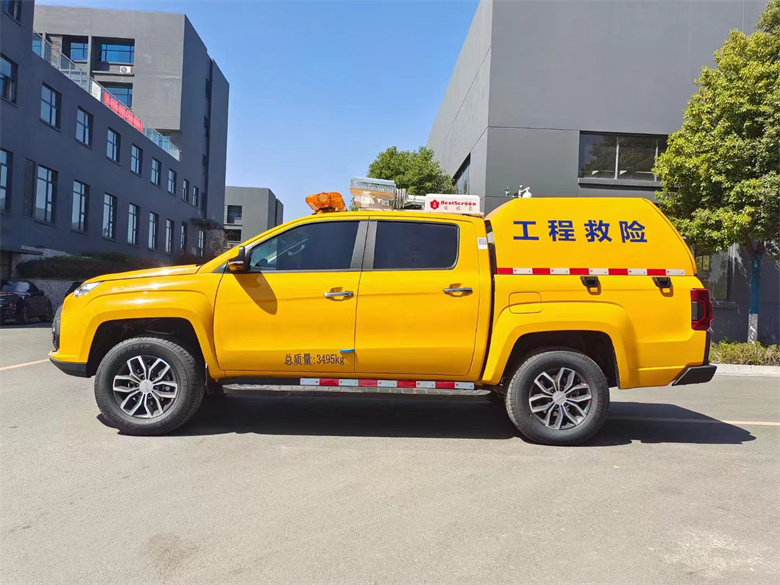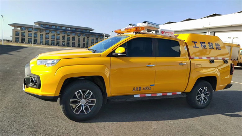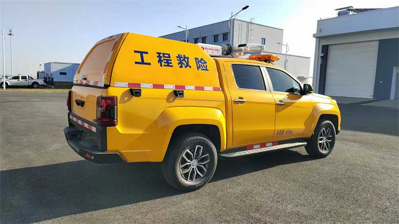 江鈴電動皮卡工程救險車車輛配置:江鈴域虎EV純電動雙排皮卡,車身顏色為工程黃,浙江方正120KW永磁同步電機/,3085軸距,磷酸鐵鋰電池,續(xù)航里程360km,快充只需0.75小時,最高時速 100km/h,自動擋變速箱,駕駛室?guī)г瓘S空調(diào),方向助力,ABS,電動玻璃,中控門鎖,遙控鑰匙,可調(diào)節(jié)大燈,行車記錄儀,倒車影像等。