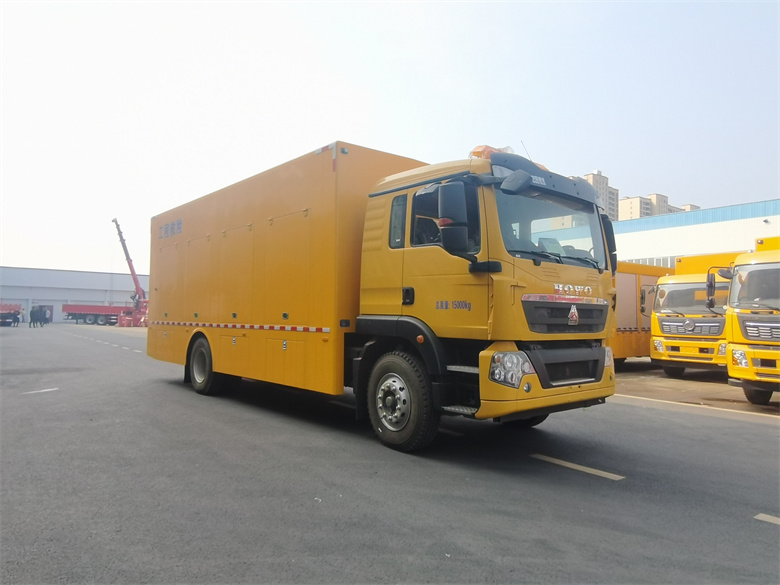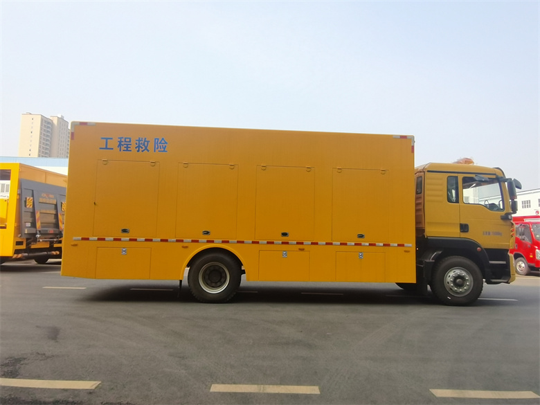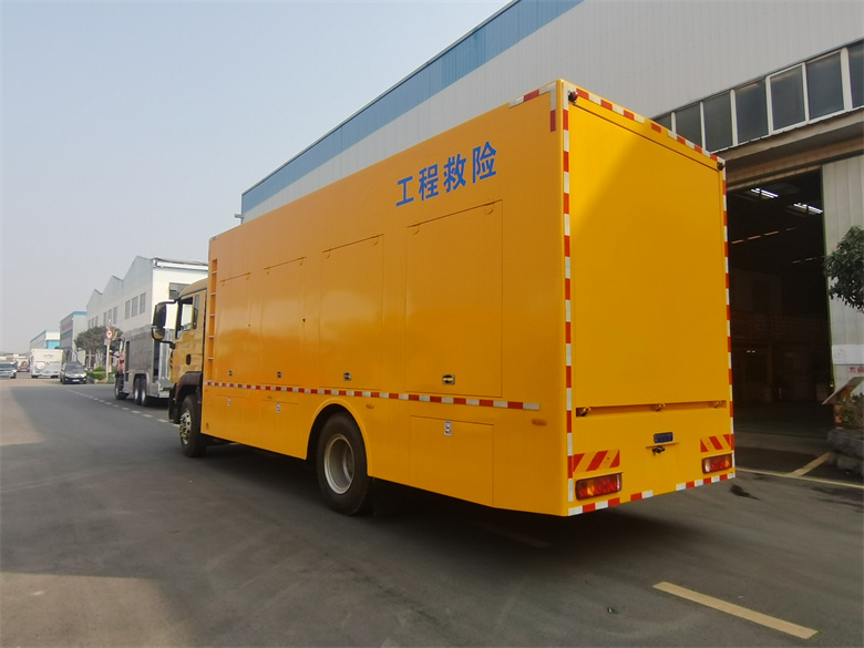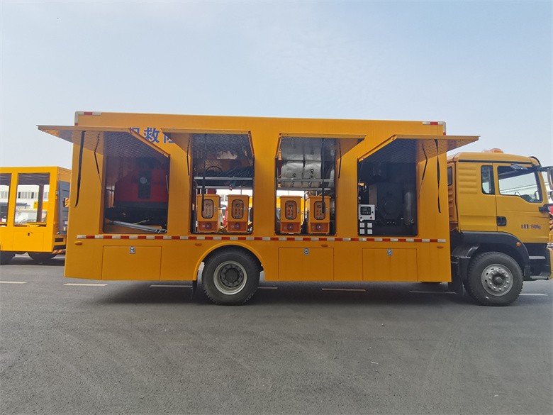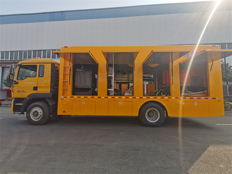 重汽豪沃3000方排澇車-工程救險車標(biāo)準(zhǔn)配置:整車采用優(yōu)質(zhì)碳鋼方管骨架,1.5mm 厚蒙皮,先進(jìn)的噴涂技術(shù),車廂整體防銹、防腐使用年限更長,廂體外部鋼材為優(yōu)質(zhì)冷軋鋼板,內(nèi)襯優(yōu)質(zhì)冷軋鋼板折彎骨架,工藝先進(jìn),強(qiáng)度牢固。廂體為全密封結(jié)構(gòu),具備運(yùn)輸、防雨、防腐、防火、防銹要求。車廂尾部為對開門。發(fā)電機(jī)組進(jìn)排風(fēng)消聲處理,消聲器做降噪處理。車輛安裝四只液壓支撐腿,可在駐車狀態(tài)均分車輛靜壓,保護(hù)車輪及彈簧鋼板。選用進(jìn)口優(yōu)質(zhì)多路閥組,液壓支撐缸采用進(jìn)口密封件,單支腿靜載荷 8 噸,加裝雙向液壓鎖。底盤發(fā)動機(jī)全功率取力液壓動力源,驅(qū)動排水機(jī)器人、液壓油箱、散熱器、水帶液壓卷盤、液壓油管卷盤等液壓系統(tǒng)工作。定制分動箱,進(jìn)口高壓液壓油泵,高效能轉(zhuǎn)換,平穩(wěn)無極調(diào)速,為車輛節(jié)約空間,整車液壓系統(tǒng)布局合理。