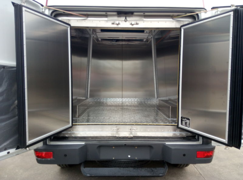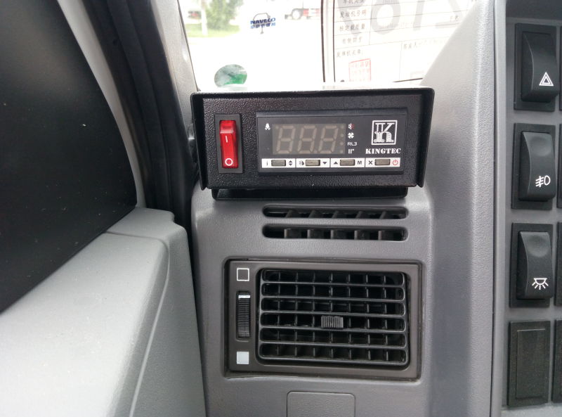 壓縮機直流電機驅動,與冷凝器一體,頂置安裝;使用制冷機組型號為ET100,對車載發(fā)電機有一定要求,目前6立方, -5℃,發(fā)電機要達到150A;該裝置自帶備電裝置。